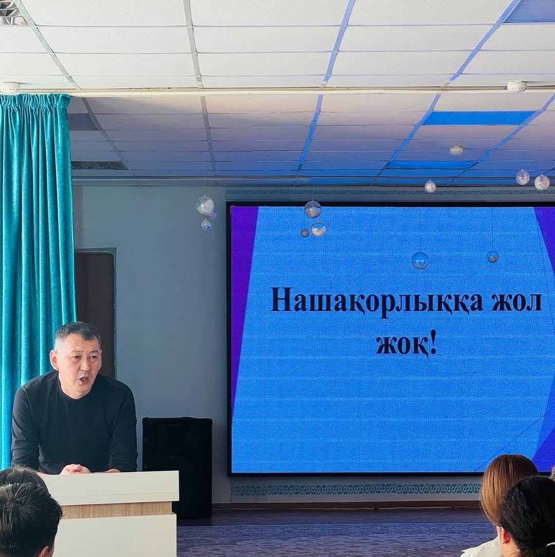Іс-шара мақсаты: жаһандану қарқынды жүріп жатқан уақытта өмір сүріп жатырмыз. Ел болашағы-жастардың бойында отансүйгіштік пен еңбекке деген құрметті қалыптастыру, адамгершіліктің асыл қасиеттерін сіңіру, адам құқықтары мен бостандықтарын қадірлеу, ұлттық құндылықтарды дамытудың маңызы артып келеді. Өйткені әлеуметтік желілерден алынған, ақпараттардың шамадан тыс көптігі өскелең ұрпаққа оң әсерімен қатар елеулі қауіп-қатер де төндіріп отырғаны жасырын емес. Сондай жағымсыз әдеттердің бірі - нашақорлық. Атап айтқанда, нашақорлыққа, темекіге және құмар ойындарға тәуелділіктің зардабы кеңінен түсіндіріліп, елімізде синтетикалық ескірткіні өндіру, сақтау және таратуға қылмыстық жауапкершілік қарастырылғандығы жөнінде ақпарат берілді.