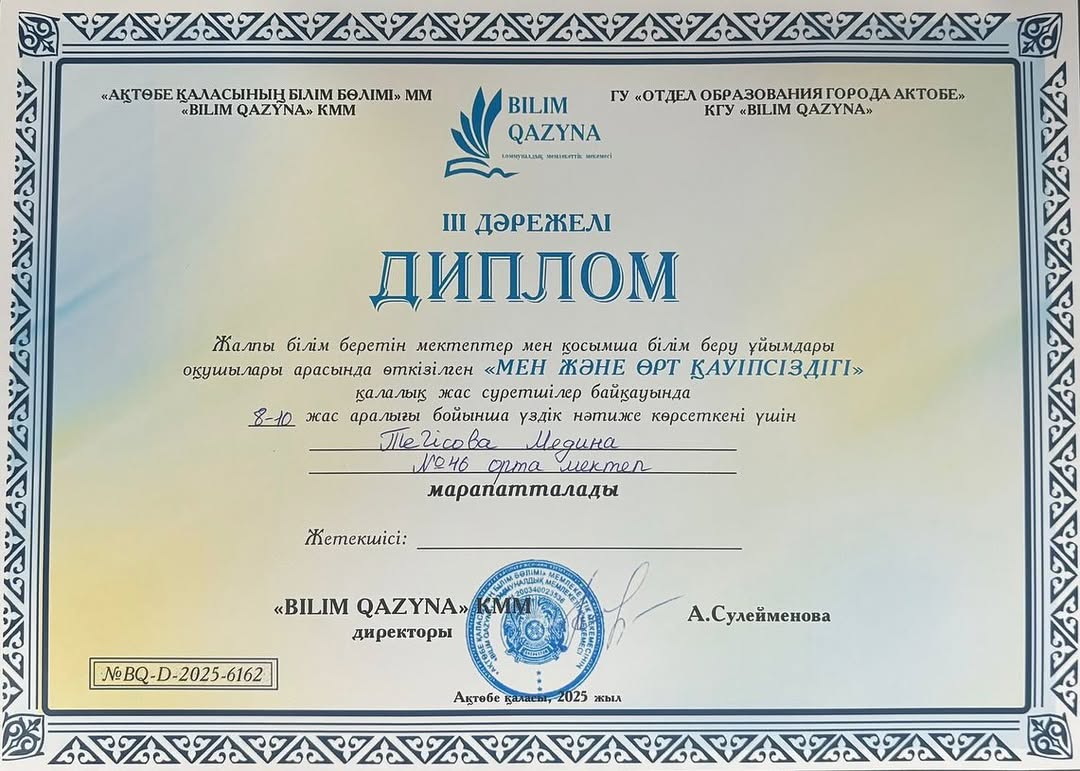 «Мен және өрт қауіпсіздігі» қалалық жас суретшілер байқауында 3 «А» сынып оқушысы Аманғали Қымбат – I орын, жетекшісі – Ахметкаримова Гульжанат, көркем еңбек пәні мұғалімі. Ал 3 «А» сынып оқушысы Тегісова Медина – III орын, жетекшісі – Тажмагамбетова Шалқаргүл. Балалардың еңбегі мен шығармашылығы жарқырап, еңбектері лайықты бағасын алды. Шығармашылыққа деген талпынысы мен жауапкершілігі үшін шәкірттерімізге алғыс айтамыз.